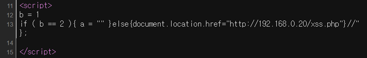 b์ ๊ฐ์ด 2๊ฐ ์๋ ๊ฒ์ ํ์ฉํ์ฌ else ๋ฌธ์ ํตํด document.location์ ์ง์ ํด์ฃผ๋ฉด ํด๋น ๋งํฌ๋ฅผ ์ ์ํ ์ฌ์ฉ์๋ ๊ณต๊ฒฉ์๊ฐ ์ง์ ํด๋ ๊ฒฝ๋ก๋ก ์๋ ์ด๋ํ๊ฒ ๋ฉ๋๋ค.