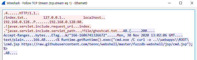 servlet_pathμ κ²½λ‘λ₯Ό μ λ‘λλ ghostcat.txtλ‘ λ°κΏμ μμ²νκ³ μμ² uri μ 보λ index.jsp ννλ‘ λ³νμν΄μΌλ‘μ¨ μλ² μ¬μ΄λ μΈμ΄ ννλ‘ μ€νλλλ‘ νκ³ μμ΅λλ€.