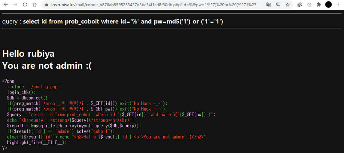 ๊ดํธ ๊ตฌ๋ถ์ด ๋ช ํํ์ง ์์์ค ์๊ณ ๊ดํธ๋ก ๊ตฌ๋ถํด ๋ดค์ง๋ง rubiya๋ฅผ ํ์ํ๋ค๋ ๋ฌธ๊ตฌ๊ฐ ๋์ค๊ณ ์ฑ๊ณต๋์๋ค๋ ๋ฌธ๊ตฌ๋ ๋์ค์ง ์์ต๋๋ค. ์์ค ๋ถ๋ถ์ ์ ๋๋ก ํ์ธํด๋ณด๋ [ id ] == admin์ผ๋ก ๋ ๊ฒ์ผ๋ก ๋ณด์ ์ ๋ ฅ๋๋ id๋ "admin" ์ด์ฌ์ผ ๋๋ค๋ ๊ฒ์ ๋ค๋ฆ๊ฒ ๊นจ๋ฌ์์ต๋๋ค.