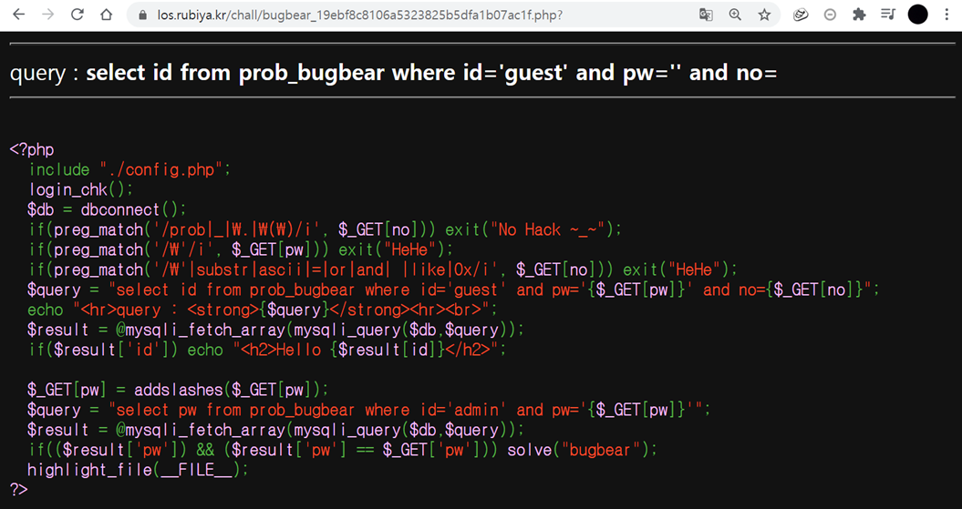 $query = "select pw from prob_bugbear where id='admin' and pw='{$_GET [pw]}'";