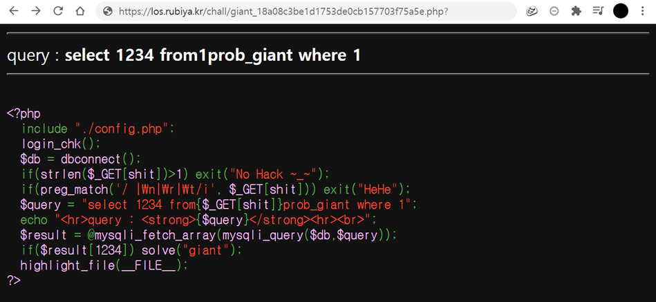 $query = "select 1234 from{$_GET[shit]}prob_giant where 1";