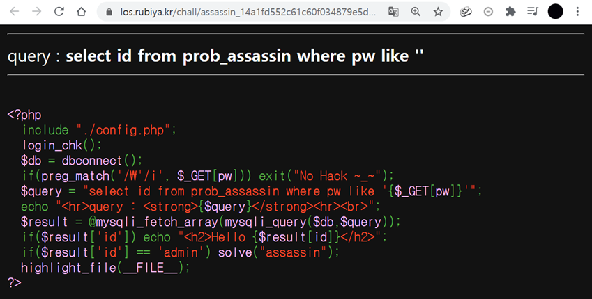 if($result['id'] == 'admin') solve("assassin");