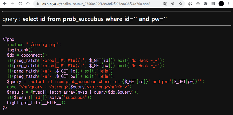 $query = "select id from prob_succubus where id='{$_GET[id]}' and pw='{$_GET[pw]}'";