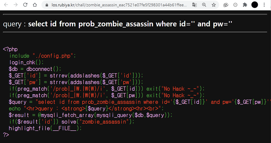 $query = "select id from prob_zombie_assassin where id='{$_GET[id]}' and pw='{$_GET[pw]}'";
