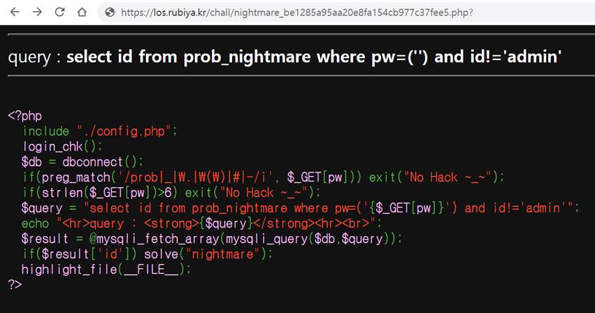 ๋ฌธ์ ๋ฅผ ํด๊ฒฐํ๊ธฐ ์ํด์ if($result['id']) solve("nightmare"); ์ฒ๋ผ admin ์ด ์๋ ์๋ฌด๋ฐ ๊ณ์ ์ผ๋ก ์ ๊ทผ๋ง ํ๋ฉด ํต๊ณผ์
