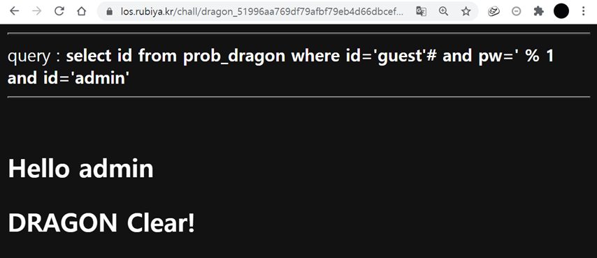 if($result['id'] == 'admin') solve("dragon");