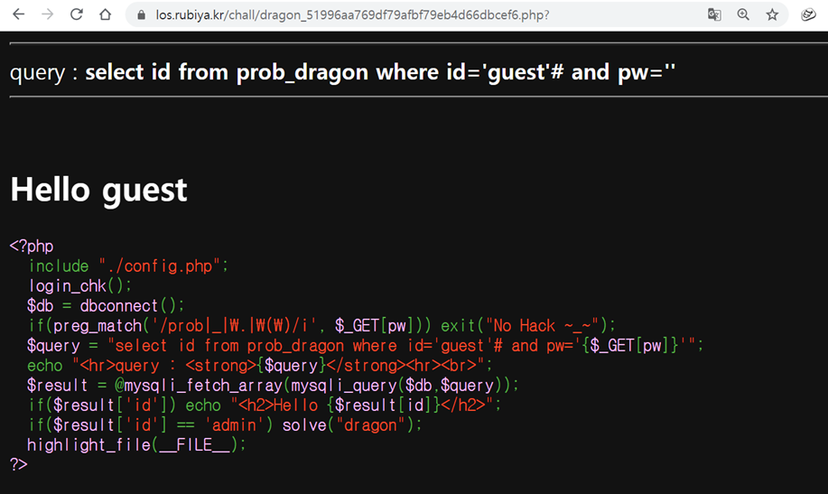 $query = "select id from prob_dragon where id='guest'# and pw='{$_GET[pw]}'";