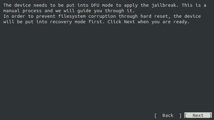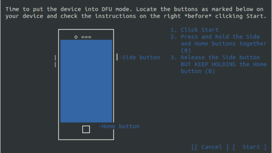 "Next"๋ฅผ ๋๋ฅด๋ฉด ์ด์ DFU ๋ชจ๋๋ก ์ ๊ทผํ๊ฒ ๋ฉ๋๋ค. ์ด๋ ๋ณต๊ตฌ ๋ชจ๋๋ฅผ ์๋ฏธํ๋ฉฐ ์์ ์ ๋จ๋ง์ ๋ณด๋ฉด ์ฑ๊ณต์ ์ผ๋ก ๋ณต๊ตฌ ๋ชจ๋๋ก ๋ค์ด์ ๊ฒ์ ํ์ธํ ์ ์์ต๋๋ค.