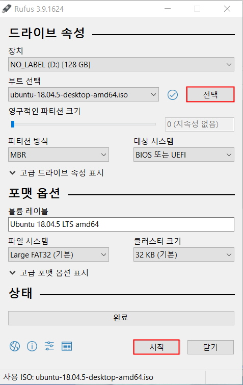 rufus๋ฅผ ์คํ ํ 4GB ์ด์์ USB ์ฅ์น๋ฅผ ๊ผฝ์ผ๋ฉด ๋๋ผ์ด๋ธ ์์ฑ์ ์ฅ์น๋์ ์ธ์์ด ๋ฉ๋๋ค. ๊ทธ๋ฆฌ๊ณ ๋ถํธ ์ ํ์ ํด๋ฆญํ์ฌ ์ฒ์์ ๋ค์ด๋ก๋ํ Ubuntu 18.04 ์ด๋ฏธ์ง๋ก ๋ถํ USB๋ฅผ ๋ง๋ค๋๋ก ์์์ ๋๋ฌ์ฃผ๋ฉด ๋ฉ๋๋ค.