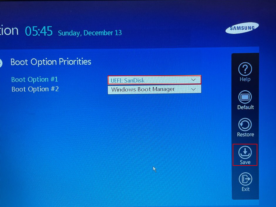 Boot Option #1 ๋ฉ๋ด์๋ Windows Boot Manager๋ผ๊ณ ์ ํ๋์ด ์์ง๋ง ์ฐ๋ฆฌ๋ ubuntu ์ด๋ฏธ์ง๋ฅผ ๋ถํ ์์ผ์ผ ๋๊ธฐ ๋๋ฌธ์ ์์ ์ USB๋ก ๋ณ๊ฒฝํ์ฌ -> SAVE๋ฅผ ๋๋ฌ์ค๋๋ค.