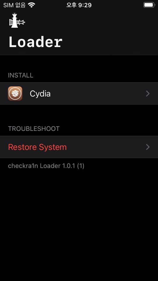 Exploit ์ด ๋ชจ๋ complete ๋๊ณ ์์ดํฐ์ด ์ฌ๋ถํ ๋๋ฉด Checkra1n ์ด๋ผ๋ App์ด ์ค์น๋์ด ์์ ๊ฒ๋๋ค. ํด๋น Checkra1n์ ์คํ์์ผ์ฃผ์๋ฉด Cydia ์ฑ์ ์ค์นํ ์ ์๊ฒ ๋ฉ๋๋ค.
