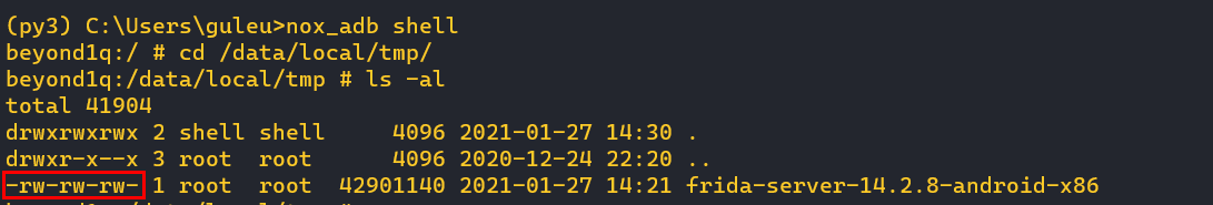nox_adb push ๋ช ๋ น์ ํตํด pc์์ ์์ถ ํด์ ํ frida-server๋ฅผ ์ฝ์ ํ์ฌ ์ค์น์์ผ์ฃผ์๋ฉด ๋ฉ๋๋ค.