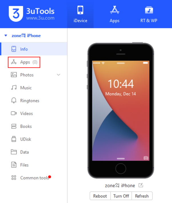 3 uToolsλ₯Ό μ€νμν€κ³ μμ μ λλ°μ΄μ€λ₯Ό μ°κ²°ν΄μ€ ν "Apps" λ©λ΄λ‘ λμ΄κ°λλ€.