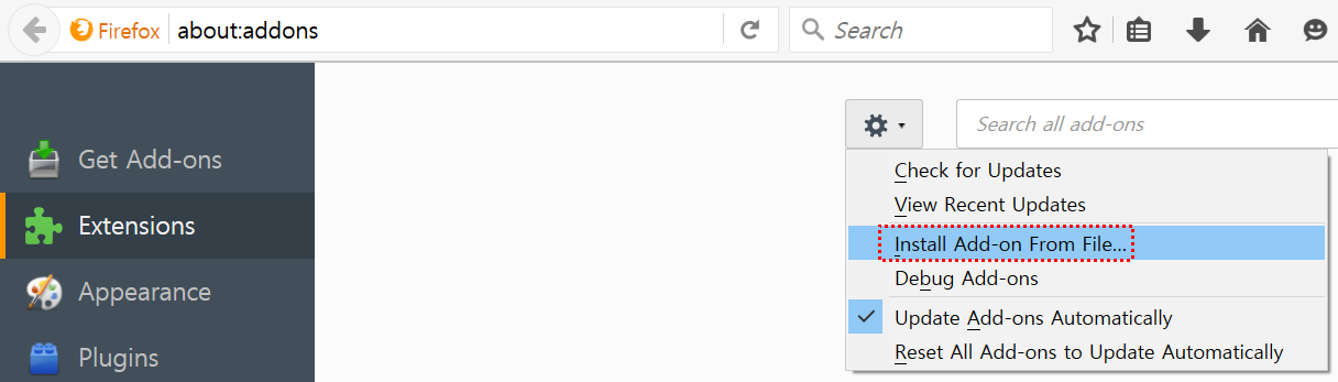 ํฑ๋๋ฐํด ๋ชจ์์ ํด๋ฆญํ๋ฉด "Install Add-on From File" ์ด ์๋๋ฐ ์ด๊ฒ์ ํด๋ฆญํด์ฃผ์๋ฉด ์ธ๋ถ์์ ๋ค์ด๋ก๋ํ ํ์ผ์ ์ถ๊ฐํ ์ ์๊ฒ ๋ฉ๋๋ค.