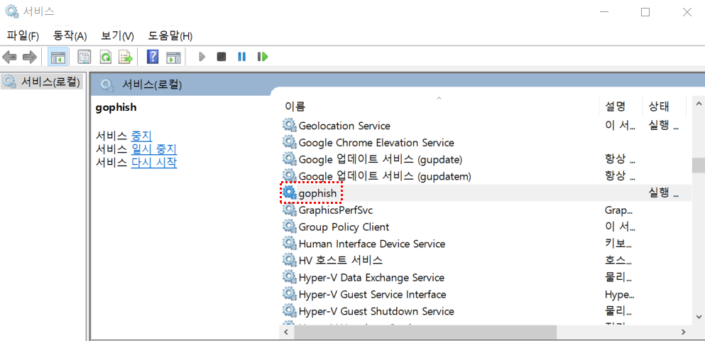 ์๋น์ค์ gophish์ด๋ฆ์ผ๋ก ์ถ๊ฐ๋ ๊ฒ์ ํ์ธํ ์ ์์ต๋๋ค. PC๊ฐ ์คํ๋ ๋ ์๋์ผ๋ก ์คํ๋๋๋ก ๋์ด ์์ผ๋ฉฐ ์๋์ผ๋ก ์คํ๋๊ฒ๋ ๋ณ๊ฒฝํ ์๋ ์์ต๋๋ค.