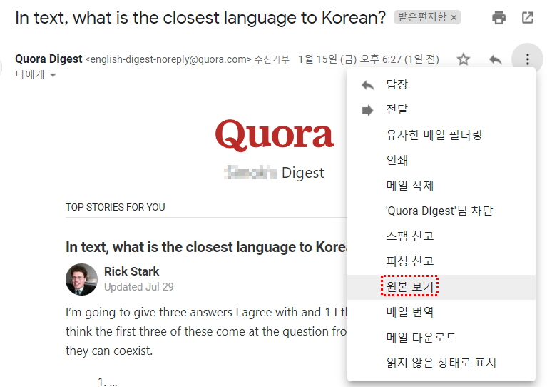 ๋ง์ฝ ์ธ๋ถ์์ ๋ฐ์ ์ด๋ฉ์ผ ํ ํ๋ฆฟ์ ์ฌ์ฉํ๊ณ ์ถ๋ค๋ฉด ๋ฉ์ผ์์ "์๋ณธ ๋ณด๊ธฐ"๋ฅผ ํตํด ํด๋ฆฝ๋ณด๋ ํ์์ผ๋ก ๊ฐ์ ธ์ค์ค ์ ์์ต๋๋ค.