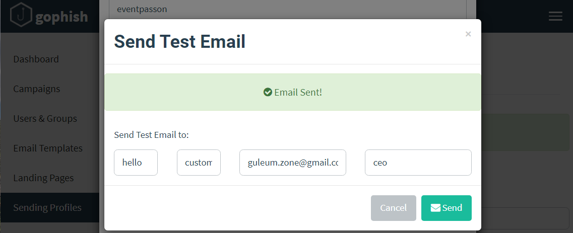 Gophish์ ์ง์ ๋ ๊ธฐ๋ณธ ๋ฉ์ผ์ด ์ ์ก๋ ๊ฒ์ ํ์ธํ ์ ์์ต๋๋ค. ํ ์คํธ ๋ฉ์ผ๋ ์ ์์ ์ผ๋ก ์ ๋ฌ์ด ๋์์ผ๋ ์ด์ ์บ ํ์ธ์ ์งํํ๊ธฐ ์ํ ๊ฐ๊ฐ์ ์์ญ๋ค ์ค์ ํด์ฃผ์๋ฉด ๋ฉ๋๋ค.