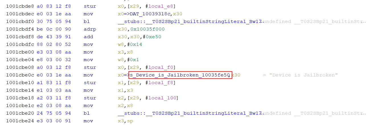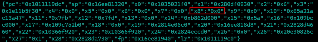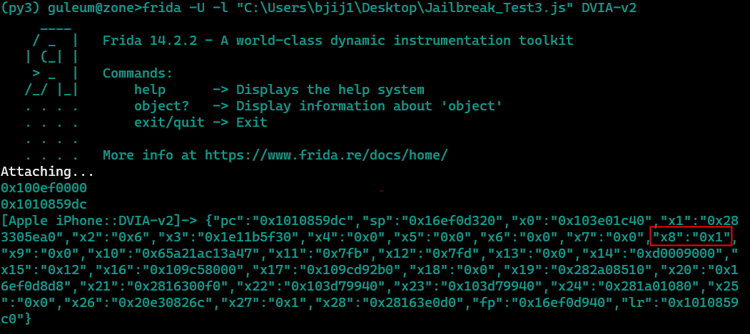 μμ ν μ½λλ₯Ό λ€μ μ¬μ€νν΄λ³΄λ©΄ x8(w8)μ κ°μ΄ 0μΌλ‘ μμ λ κ²μ νμΈν μ μμ΅λλ€. μ΄λ‘μ¨ true λ‘μ§μΈ κ²½μ°μ LAB_100195 da8λ‘ μ΄λνκ² λμ΄ "Device_is_Not_Jailbreak"μ΄ μΆλ ₯λκ² λ©λλ€.