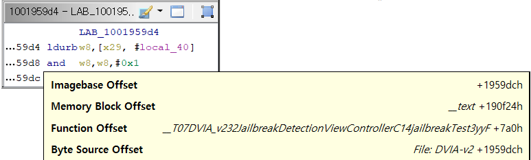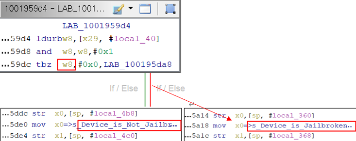 Graph Functionμ λλ₯΄λ©΄ DVIA λ‘μ§μ νλ¦μ νμ ν μ μμ΅λλ€. w8κ³Ό 0x0 κ°μ μνΈκ΄κ³λ₯Ό ν΅ν΄LAB_100195 da8μΌ κ²½μ° Device_is_Not_JailbrokenμΌλ‘ μ΄λλκ³ μλλ©΄ Device_is_Jailbrokenμ΄ μλ λ‘μ§μΌλ‘ μ΄λλκ³ μμμ νμΈν μ μμ΅λλ€.