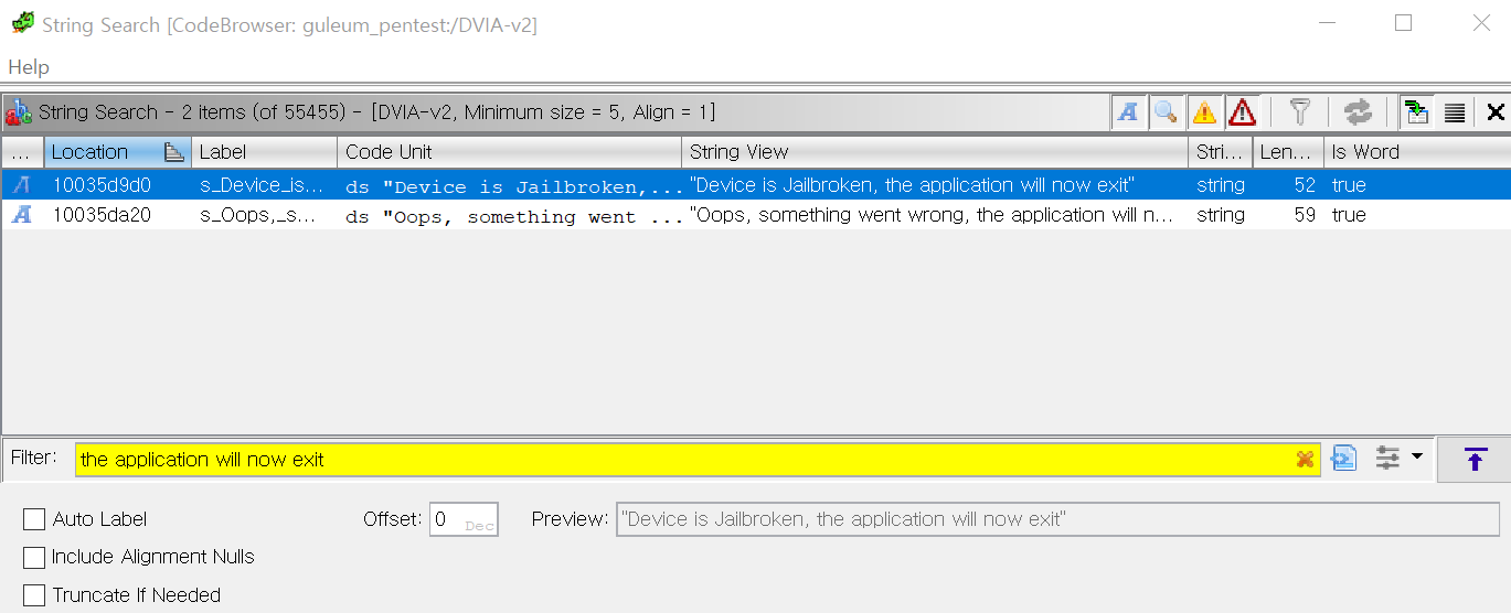 λΆμμ νμν λ¬Έμμ΄μ "device is jailbroken"μ΄λ©° Filterμ μ λ ₯νλ©΄ λ°μ΄λ리 νμΌ λ΄λΆλ₯Ό κ²μνμ¬ λνλ΄ μ€λλ€.