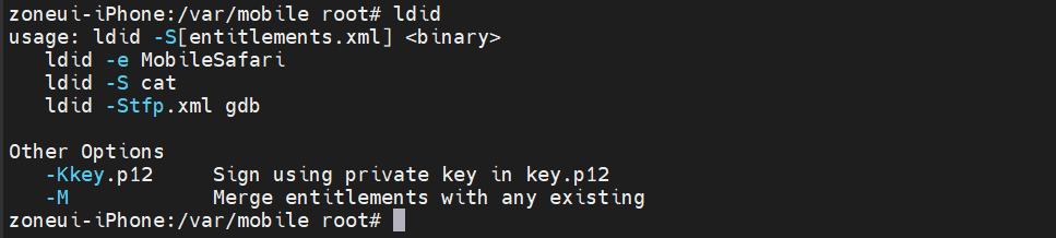 ๋๋ฐ์ด์ค์ PC๋ฅผ SSH๋ฅผ ํตํด ์ฐ๊ฒฐ ํ "ldid" ๋ช ๋ น์ ์ ๋ ฅํด ์ค์น๊ฐ ๋์ด ์๋์ง ํ์ธํฉ๋๋ค.