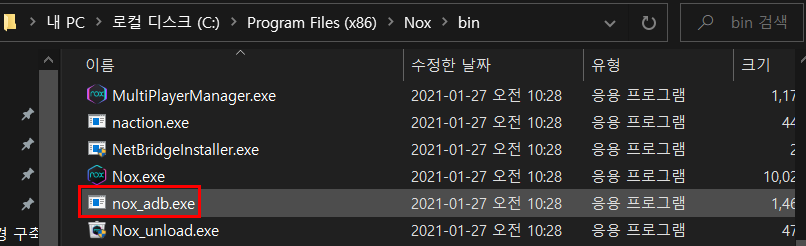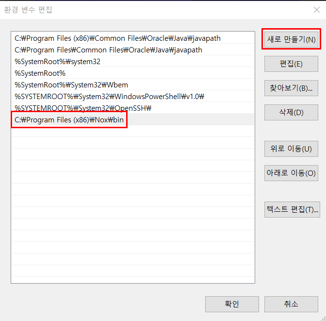 ์๋ก ๋ง๋ค๊ธฐ๋ฅผ ํด๋ฆญํ์ ํ ์์ ์ Nox์ฑ ๋๋ ํ ๋ฆฌ์ -> "bin" ํด๋๊น์ง ๊ฒฝ๋ก๋ฅผ ์ก์์ ์ถ๊ฐํด์ฃผ์๋ฉด ์ค์ ์๋ฃ์ ๋๋ค.