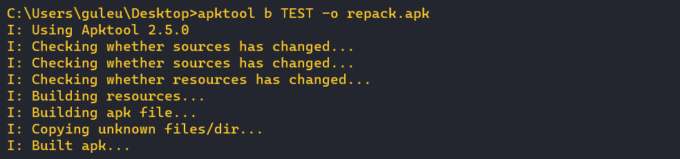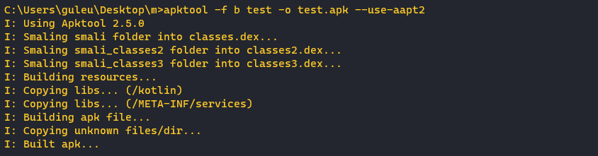 apktool -f b <ν¨ν€μ§ν ν΄λλͺ > -o <apkνμΌλͺ μ§μ > --use-aapt2