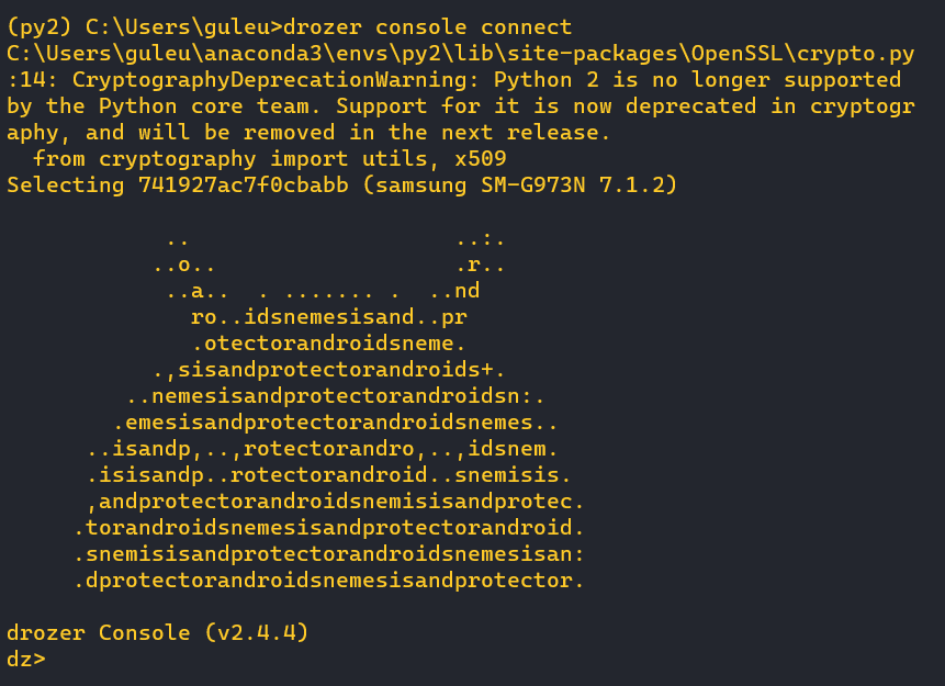 ์ปค๋งจ๋ ์ฐฝ์ ํตํด "drozer" ๋ช ๋ น์ ์ ๋ ฅํด๋ณด์๋ฉด ์ฌ์ฉ ๊ฐ๋ฅํ ์ต์ ๋ค์ด ๋ํ๋ฉ๋๋ค.