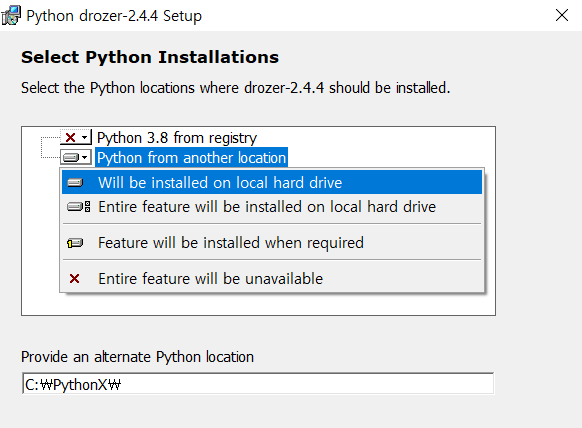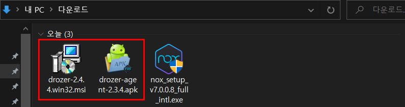 ํ๋จ์ ๋งํฌ์ ์ ์ํ์ฌ ๋ก์ปฌ PC์ ์ค์นํ "drozer-2.4.4._win32_msi" ์ ๋๋ฐ์ด์ค ๋ด๋ถ์ ์ค์นํ "drozer-agent" ํ์ผ 2๊ฐ์ง๋ฅผ ๋ค์ด๋ก๋ํด์ฃผ์๋ฉด ๋ฉ๋๋ค.
