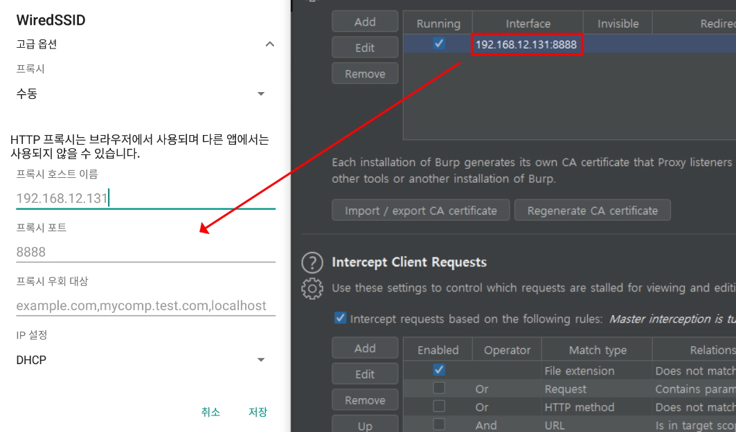 burp์ ๋จ๋ง๊ธฐ(NOX)์ Proxy IP์ ํฌํธ๋ฅผ ๋์ผํ๊ฒ ๋ง์ถฐ์ฃผ๋๋ก ํ๊ฒ ์ต๋๋ค.