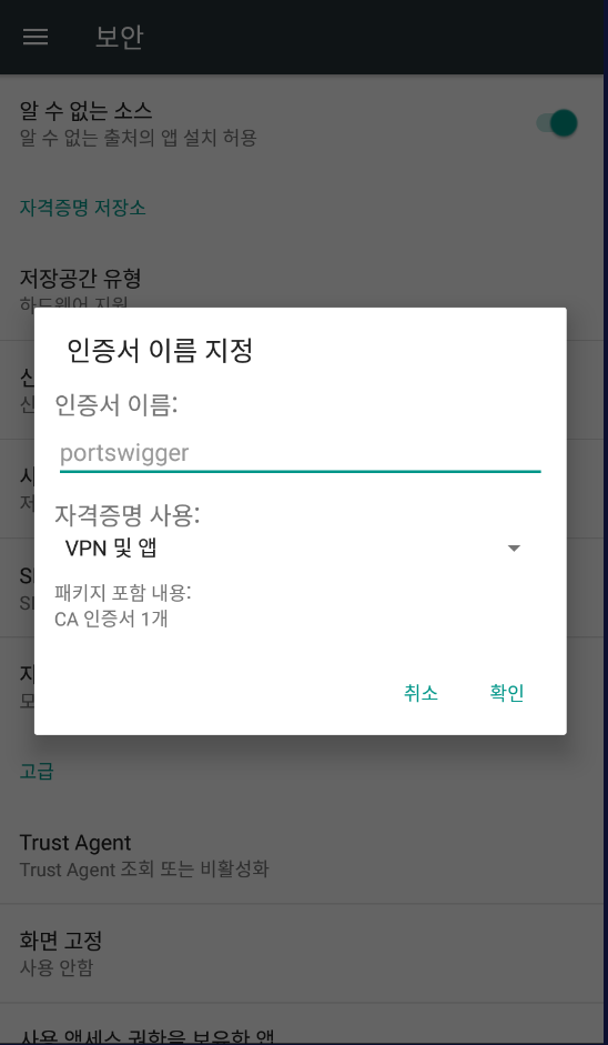 ์ธ์ฆ์๋ฅผ ํด๋ฆญํด ์ฃผ์๋ฉด ๋ฑ๋กํ ์ด๋ฆ์ ์ง์ ํ๊ฒ ๋ฉ๋๋ค. ์ ๋ ์๋ณํ๊ธฐ ์ํด portswigger๋ผ๊ณ ์ง์ ํ์ต๋๋ค.