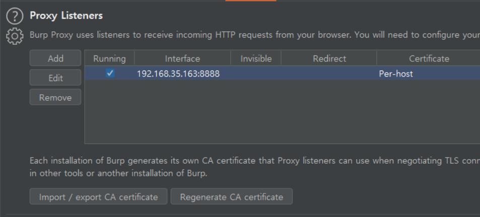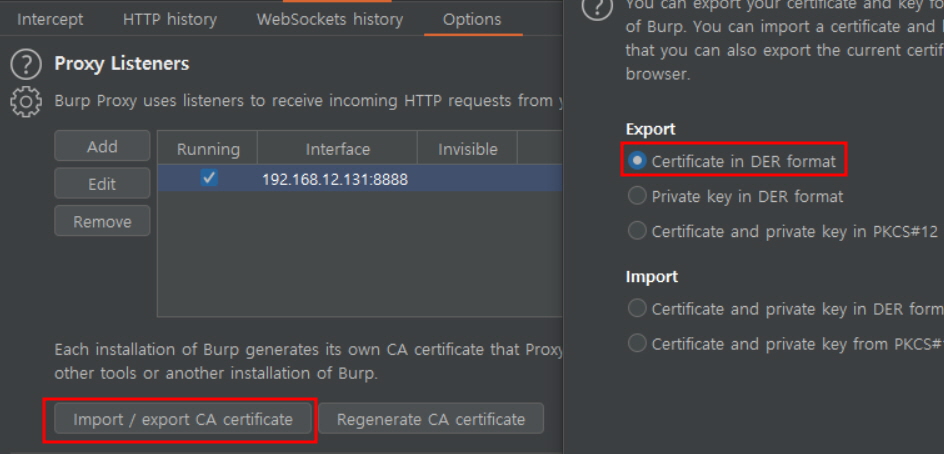 burpsuite๋ฅผ ์คํํ์ฌ ์ธ์ฆ์๋ฅผ ์ถ์ถํฉ๋๋ค. ํ์ผ์ ํ์ฅ์๋ช ์ ".der"๋ก ํด์ฃผ์๋ฉด ๋ฉ๋๋ค.