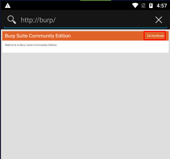 ์ธํฐ๋ท ์ฐฝ์ ์ฌ์๊ณ "http://burp/"๋ฅผ ์ ๋ ฅํด์ฃผ์๋ฉด ์๋จ์ ํ๋ฉด์ด ๋ํ๋ฉ๋๋ค. ์ฐ์ธก ์๋จ์ CA Certificate๋ฅผ ํด๋ฆญํด์ฃผ์๋ฉด ์ธ์ฆ์๊ฐ ๋ค์ด๋ก๋๋ฉ๋๋ค.