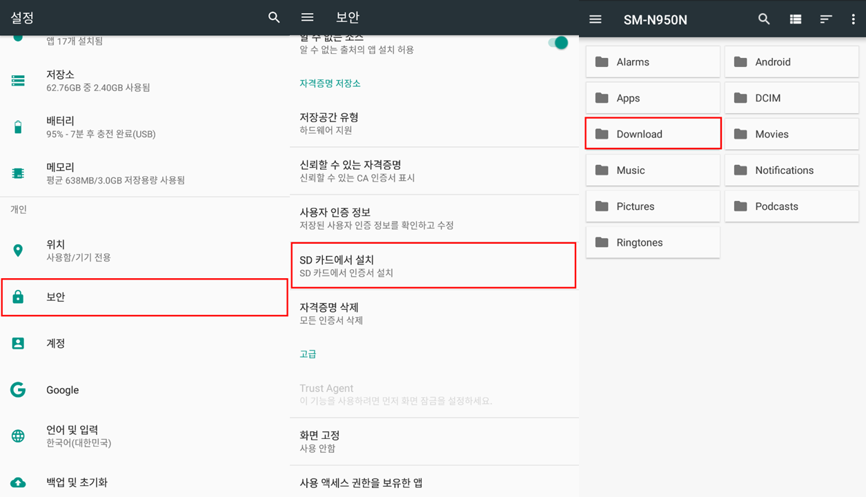 ์ธ์ฆ์๋ฅผ ์์ ์ ๋๋ฐ์ด์ค(Nox)์ ์ค์นํ๊ธฐ ์ํด ์ค์ -> ๋ณด์ -> SD ์นด๋์์ ์ค์น -> Download ๊ฒฝ๋ก๋ก ์ ๊ทผํด ์ธ์ฆ์ ํ์ผ(cacert.crt)์ด ์กด์ฌํ๋์ง ํ์ธํ๊ฒ ์ต๋๋ค.