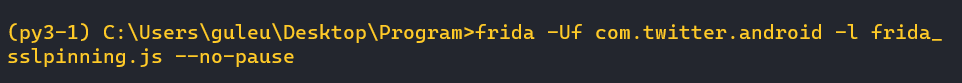 frida -Uf <ํจํค์ง๋ช > -l <์คํฌ๋ฆฝํธ ํ์ผ๋ช > --no-pause