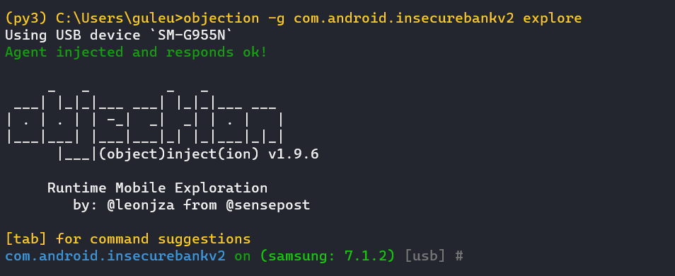 νλ¦¬λ€ μλ²λ₯Ό μ€νν΄μ£Όμ ¨μΌλ "frida-ps -U" λͺ λ Ήμ΄λ₯Ό ν΅ν΄ νλ‘μΈμ€ κ° ν΅μ μ΄ κ°λ₯νμ§ νμΈν΄ μ£Όμλ©΄ λ©λλ€. 루ν νμ§λ₯Ό μ°νν μ±μ insecurebankλ‘ νκ² μ΅λλ€.