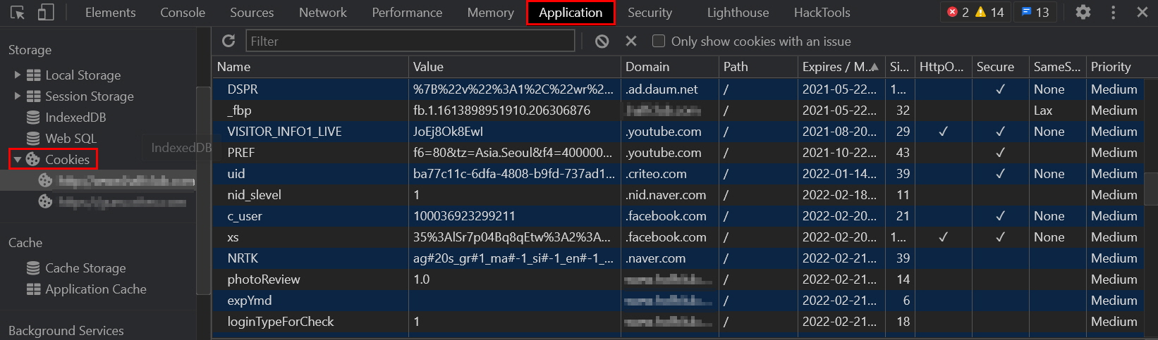 ์ธ์ ์ ๋ณ๋๋ก ๋ง๋ฃ ์๊ฐ์ด ์ง์ ๋์ด ์๋์ง ํ์ธํ๋ ค๋ฉด ๊ฐํธํ๊ฒ "๊ฐ๋ฐ์ ๋๊ตฌ(F12)" -> Application -> Cookies ํญ์ผ๋ก ๋ค์ด๊ฐ ํ์ธํด๋ณด์๋ฉด ๋ฉ๋๋ค.
