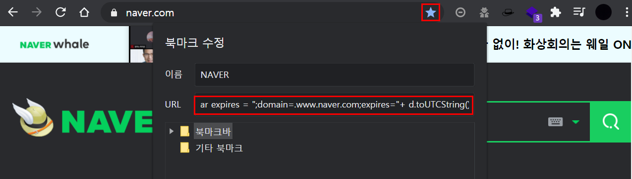 ๋ค์ด๋ฒ ํ์ด์ง๋ฅผ ์๋ฅผ ๋ค๋ฉด ์์ ๋ javascript์ฝ๋๋ฅผ ๋ถ๋งํฌ ๊ธฐ๋ฅ์ ์ฌ์ฉํด "URL" ์ฃผ์์ ๋ถ์ฌ ๋ฃ์ด ์ฃผ์๋ฉด ๋ฉ๋๋ค.