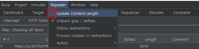 TE:CL ์ทจ์ฝ์ ์ ์ํํ๊ฒ ์งํํ๊ธฐ ์ํด์ ์๋์ผ๋ก ๊ณ์ฐ๋์ด ํ ๋น๋๋ Update Content-Length ์ค์ ์ ๋นํ์ฑํํด์ฃผ์ ์ผ ์ํํ๊ฒ ํ ์คํธ๊ฐ ๊ฐ๋ฅํฉ๋๋ค. ์ ๊ทธ๋ฌ๋ฉด ๋ณธ๋ฌธ์ ์ถ๊ฐ๋ ๋ฐ์ดํฐ์ ๊ธธ์ด ๋ชจ๋๋ฅผ ์๋์ผ๋ก ๊ณ์ฐํ์ฌ ํ ๋นํ๊ธฐ ๋๋ฌธ์ Smuggling์ด ๋ฐ์ํ์ง ์์ต๋๋ค.