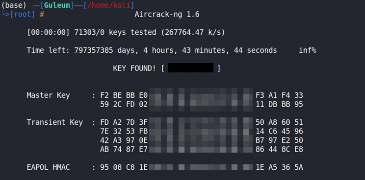 ν΄λΉ λ°μ΄ν° νμΌμ ν΅ν΄ aircrack-ngλ₯Ό μ€νν΄λ³΄λ©΄ μλμ μΌλ‘ λ¨μκ° λ΄μ ν¬λμ΄ μλ£λ©λλ€. μΌλ°μ μΈ λ°©λ²λ€κ³Ό λ€λ₯΄κ² ν€ κ°μ λΉ λ₯΄κ² νλν μ μλ μ΄μ λ "worldlist.txt"μ λ΄κΈ΄ μλ§μ μ¬μ μνΈλ€κ³Ό "guleumcrack-01.cap"μ λ΄κΈ΄ "SSID"μ λμλλ PMKλ₯Ό 미리 κ³μ°ν΄λμκΈ° λλ¬Έμ λλ€.