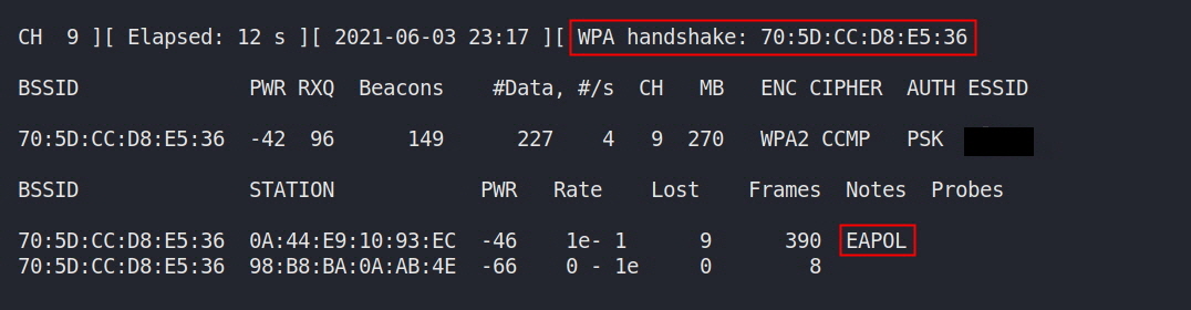 μ±κ³΅μ μΌλ‘ 4-way Handshake κ³Όμ μ μΊ‘μ²νκ² λλ€λ©΄ "EAPOL"μ΄λ μλ¨μ "WPA handshake: BSSID" λ¬Έκ΅¬κ° λνλ©λλ€.