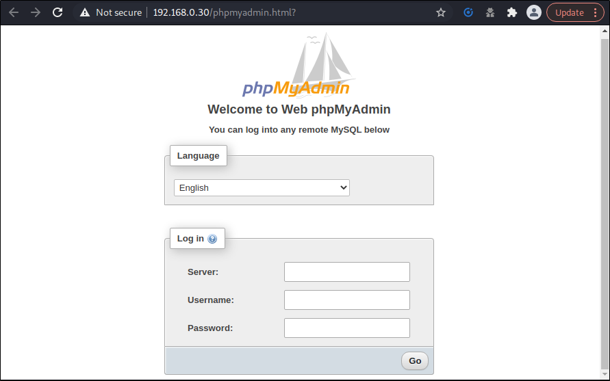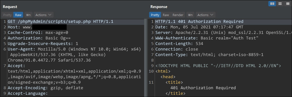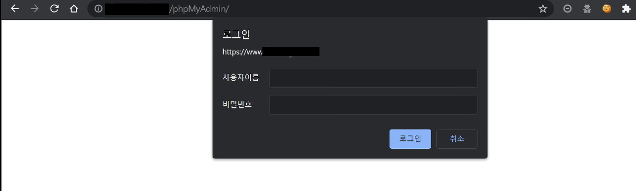 ๋ ธ์ถ๋ ๊ฒฝ๋ก๋ฅผ ํตํด์ ์ ๊ทผํด๋ณธ ๊ฒฐ๊ณผ ๋ณ๋์ 403 Forbidden์ผ๋ก ๋๋ฆฌ์ง ์๊ณ ์ธ์ฆ ํ์ด์ง๋ฅผ ๋ณด์ฌ์ฃผ๊ณ ์์ต๋๋ค. phpMyAdmin์ ๊ฒฝ์ฐ ์น ๋ธ๋ผ์ฐ์ ํ๊ฒฝ์์ ๋ฐ์ดํฐ๋ฒ ์ด์ค๋ฅผ ๊ด๋ฆฌํ๊ธฐ ์ํด 2๊ฐ์ง ์ธ์ฆ๋ฐฉ์์ ์ฌ์ฉํ๋๋ก ํ๊ณ ์์ต๋๋ค.