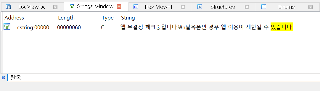 λΆμμ΄ λλ ν Shift + F12λ₯Ό λλ₯΄λ©΄ -> "String Window" μ°½μ΄ λνλ©λλ€. Ctrl + Fλ₯Ό λλ¬ μ°Ύκ³ μ νλ λ¬Έμμ΄μ μ λ ₯ν΄μ νμΈν΄μ£Όμλ©΄ λμ λλ€.